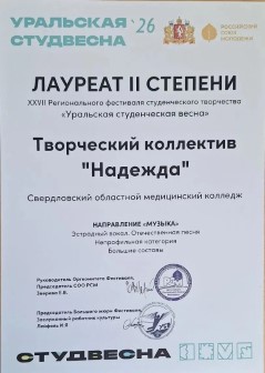 Творческий коллектив «Надежда» - Лауреат II степени — эстрадный вокал (отечественная песня). - Лауреат III степени — эстрадный вокал (зарубежная песня).