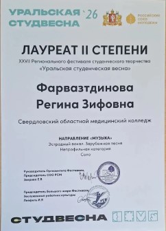 Фарвазтдинова Регина Зифовна - Лауреат II степени — эстрадный вокал (зарубежная песня). - Лауреат III степени — эстрадный вокал (отечественная песня). - Лауреат II степени — фронтовая песня.